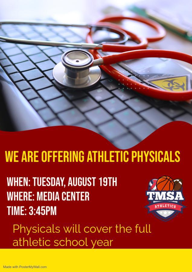 For added convenience, TMSA will administer athletic physicals on Tuesday, August 19th at 3:45 p.m. in the Media Center.