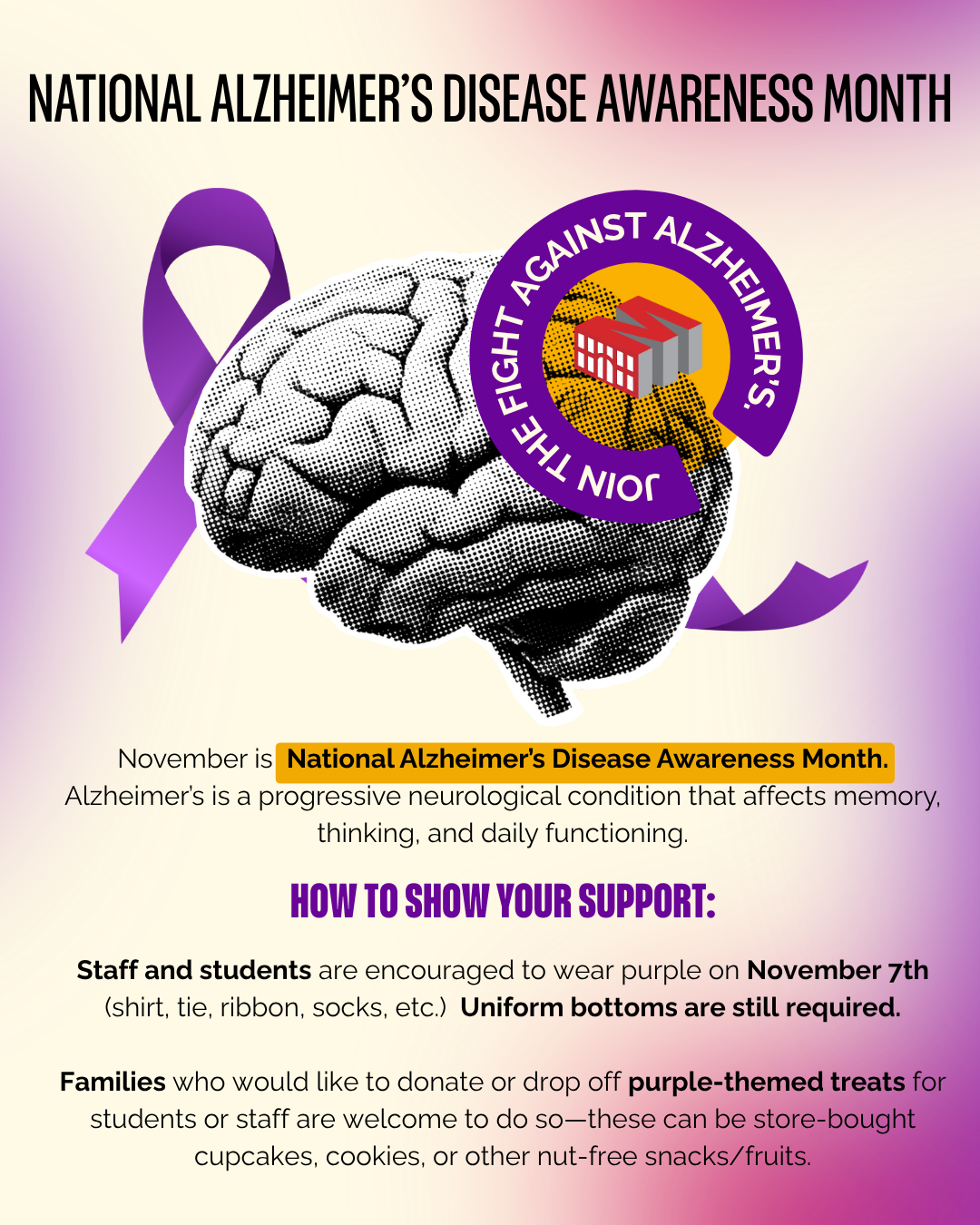 To show solidarity and spark important conversations, all students and staff are encouraged to wear something purple—such as a shirt, tie, ribbon, or socks—on Friday, November 7, in recognition of National Alzheimer’s Disease Awareness Month. Uniform bottoms will still be required.