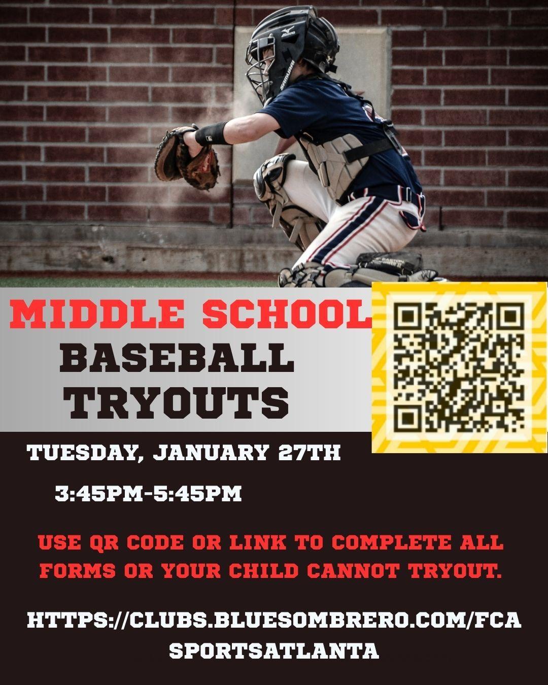 The Main Street Academy (TMSA) will hold Middle School Baseball Tryouts on campus on Tuesday, January 27, 2026, from 3:45-5:45 p.m. Please scan the QR code on the flyer below or visit the link: https://clubs.bluesombrero.com/fcasportsatlanta to complete the required forms.