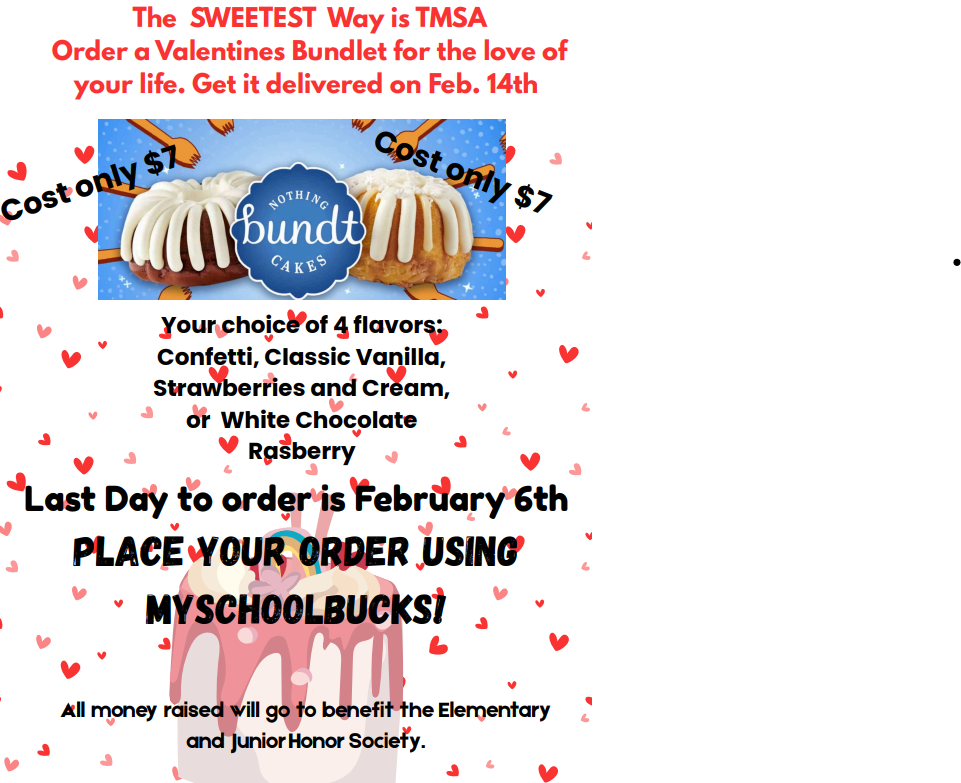 Order a Valentine's Day Bundtlet and get it delivered on February 14, 2026. Click here or scan the below QR code to place your order and support the fundraiser! The last day to place an order is February 6th.