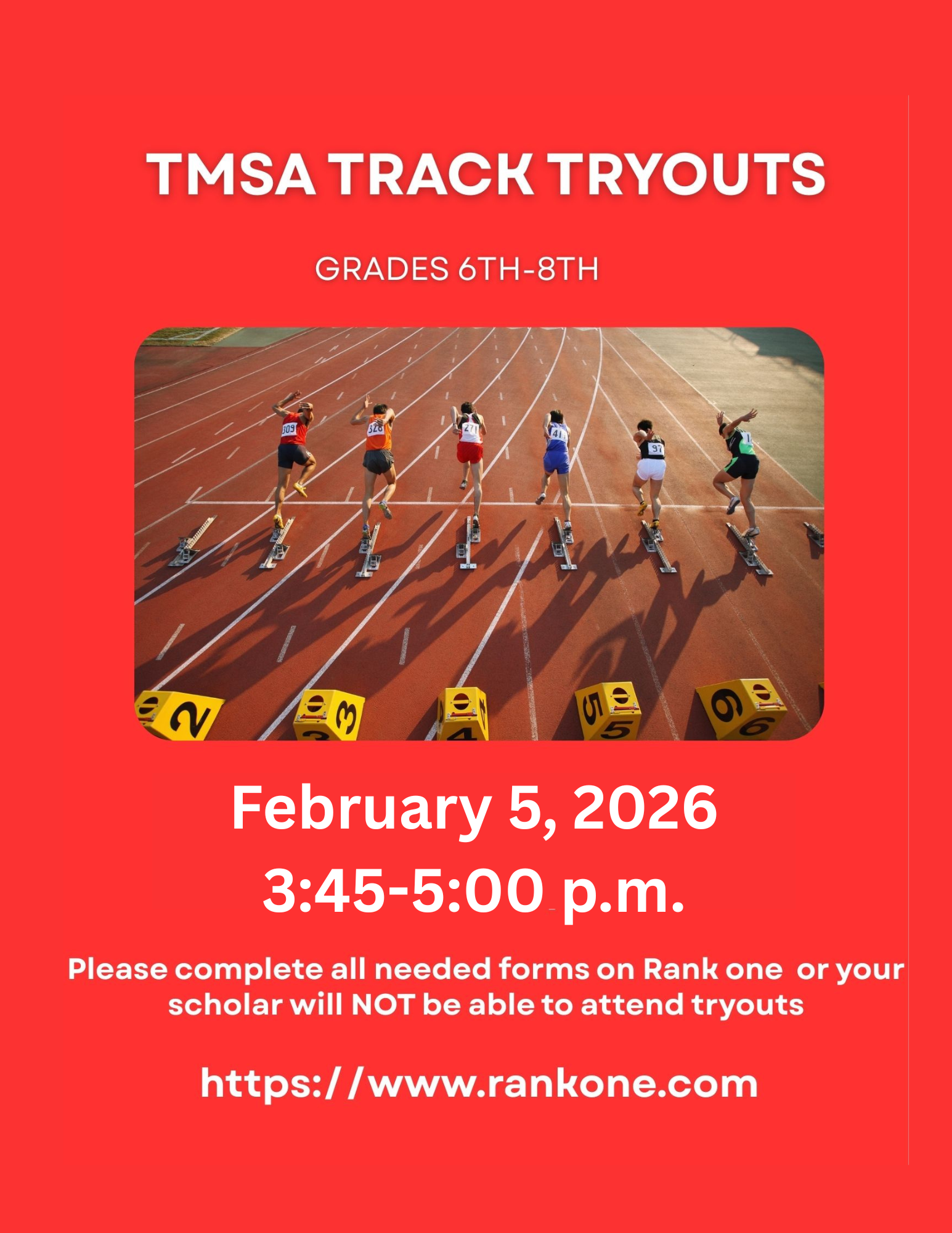 The Main Street Academy (TMSA) Track Tryouts, originally scheduled to take place on campus on January 22, 2026, have been postponed to February 5, from 3:45–5:00 p.m. for students in grades 6–8. Please complete all needed forms on Rank One or your scholar will NOT be able to attend tryouts.