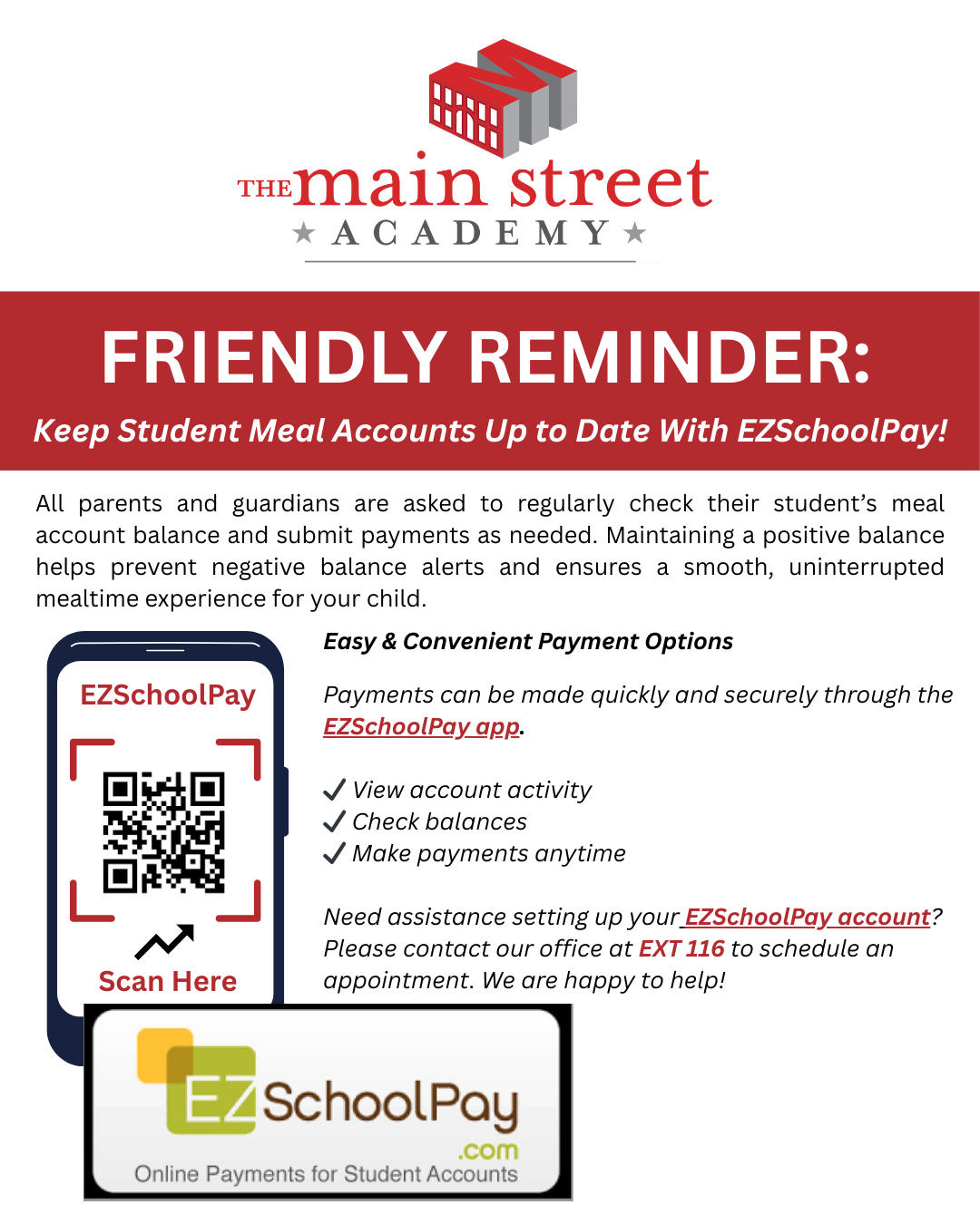 At The Main Street Academy, we are committed to ensuring every student has access to nutritious, high-quality meals each day. As we approach the end of the school year, we kindly request your support in clearing any outstanding balances. All school meal payments are due by May 30. Keeping accounts current allows us to continue providing uninterrupted meal service to all students and supports the sustainability of our school nutrition program.