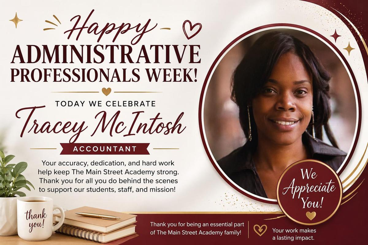 The Main Street Academy (TMSA) is proud to recognize Tracey McIntosh, Accountant, as we celebrate Administrative Professionals Week and honor her on her special recognition day.